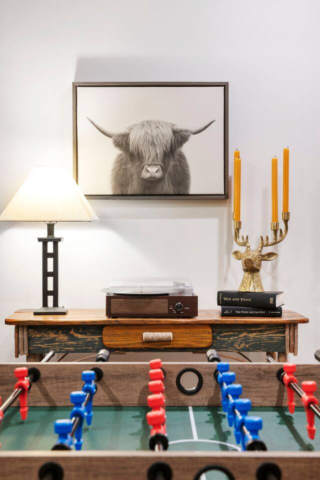 - Recreation room with vintage records & foosball table,